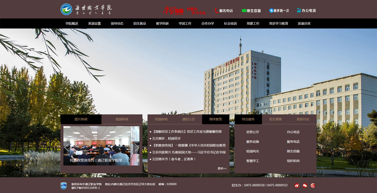 通遼職業(yè)學院是一所公辦全日制綜合性普通高等院校,以舉辦高等職業(yè)教育為主,兼?zhèn)渲械嚷殬I(yè)教育、電大開放教育和社會培訓職能。學院成立于 2004 年,由原哲盟師范學校、哲盟衛(wèi)生學校、哲盟教育學院、內(nèi)蒙古電大通遼分校合并組建而成,辦學歷史始于 1951 年。2009 年通過教育部高職高專人才培養(yǎng)工作評估,現(xiàn)為內(nèi)蒙古自治區(qū)示范性高等職業(yè)院校、自治區(qū)園林式單位、自治區(qū)文明校園,是中國教育發(fā)展戰(zhàn)略學會產(chǎn)教融合專業(yè)委員會常務理事單位、全國高職高專校長聯(lián)席會成員單位。